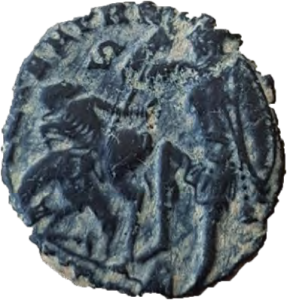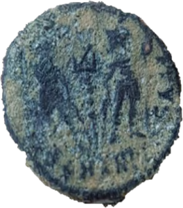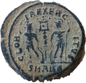 Ellerinde birer mızrak tutan iki asker yan yana, ortalarında lejyoner standartı duruyor. Etrafta: Gloria exercitus.