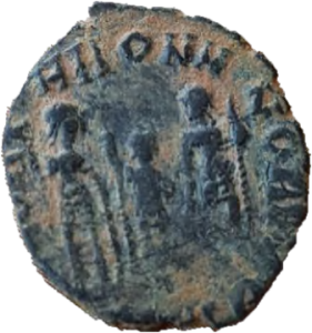 Arcadius , honorius, Theodosuis. ll Ellerinde mızrak tutuyorular. Yüz yüze duruyorlar. Etrafta: Gloria Romanorum yazısı var.