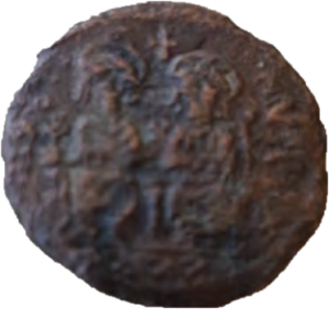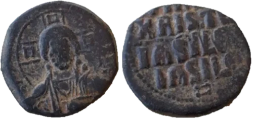 Sikke, AE, Doğu Roma 10 gr. Çapı 3cm seaby 1825 Sağa ¾ oranında dönük Hz. İsa figürü Göğsü üstünde İncil tutuyor. M.S 1034-1041 1Ön yüzü