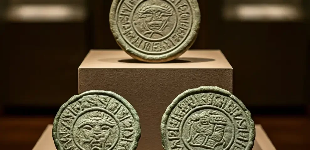 Ellerinde birer mızrak tutan iki asker yan yana, ortalarında Lejyoner standartı duruyor. Etrafta: Gloria exercitus.